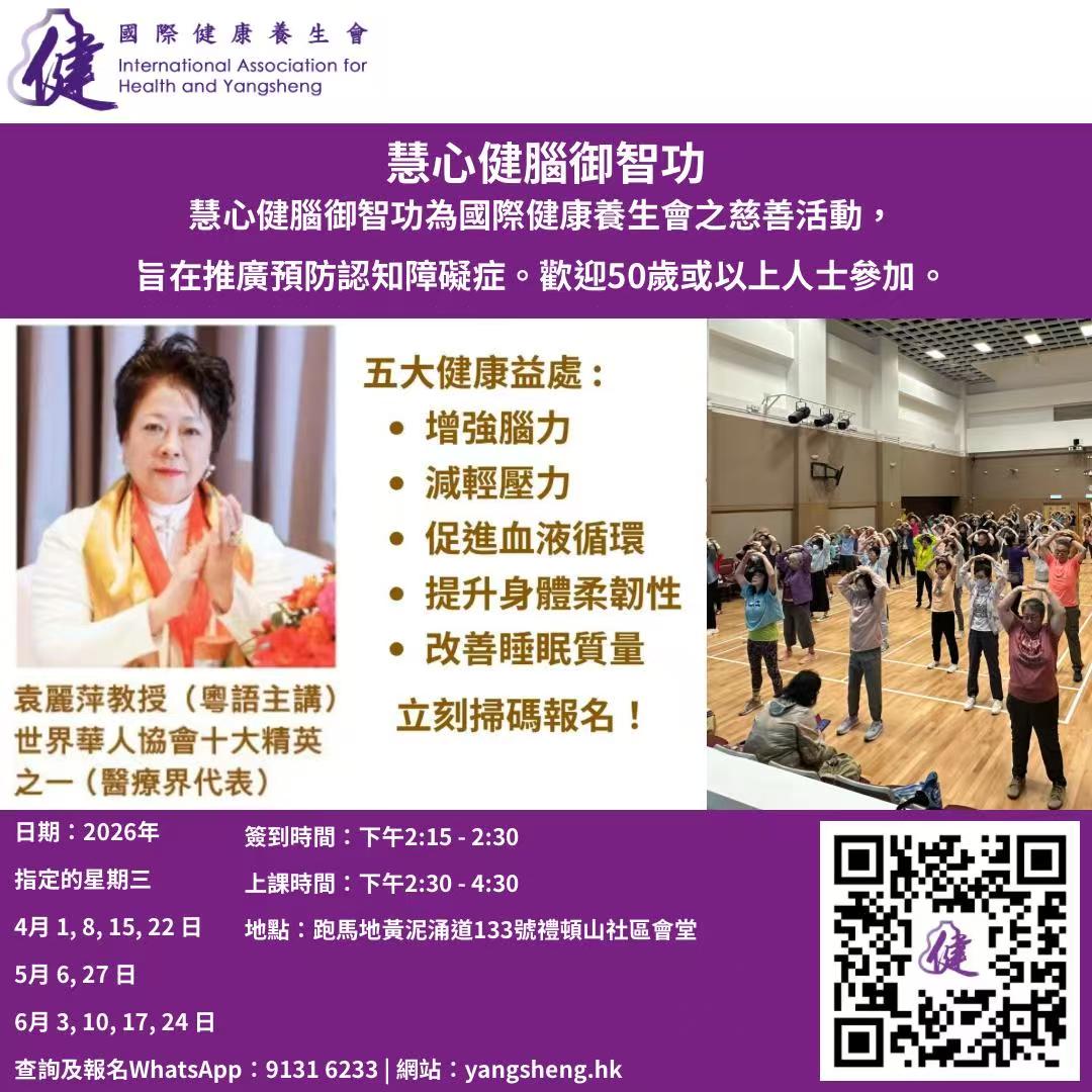 慧心健腦御智功為國際健康養生會之慈善活動,旨在推廣預防認知障礙症。歡迎50歲或以上退休人士免費參加。